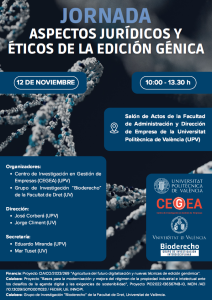 Se trata de una actividad interuniversitaria e interdisciplinar impulsada por el Centro de Investigación en Gestión de Empresas de la Universitat Politècnica de València (CEGEA) y el Grupo de Bioderecho de la Facultat de Dret de la Universitat de València en la que se abordarán los retos derivados de la irrupción de las nuevas técnicas de edición génica.